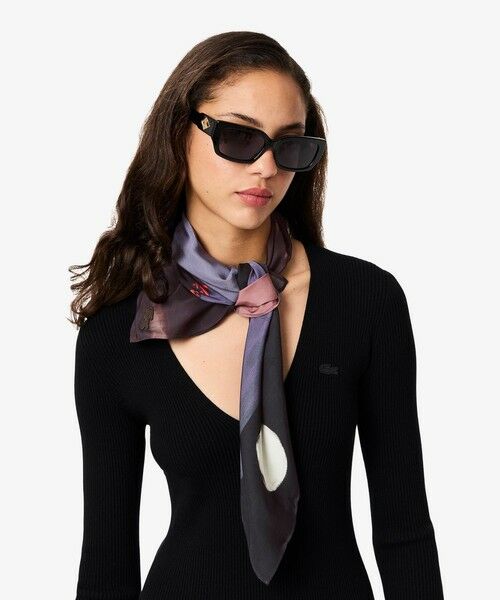 バスク地方シャンタコの幻想的な風景画をまとったランドスケーププリントスカーフ・エレガントなしなやかさを備えるレーヨン素材・ルネ・ラコステゆかりのバスク地方シャンタコをイメージした風景プリント・軽やかで流れるようなドレープ感が魅力・コーナーにワントーンのワニロゴパッチ