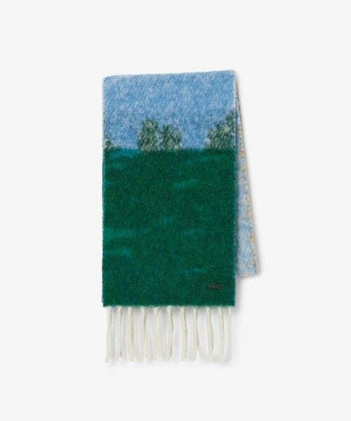 アートピースのようなランドスケープモチーフが際立つアルパカウールマフラー・アルパカ×ウール×ポリアミドのフェルト仕立て・柔らかく暖かな風合いを生む毛足感・ルネ・ラコステゆかりのバスク地方シャンタコの風景を全身に・両端にフリンジを施したクラシックな仕上げ・片端にワニロゴパッチを配置