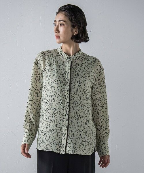 幾何ドット柄のプリントと、前立てに挟み込んだ配色テープがポイントのブラウス。
