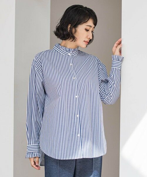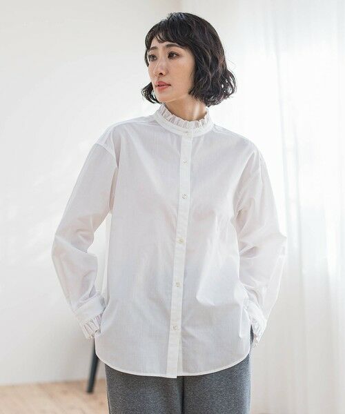ハリのあるタイプライター素材で仕立てた、ネックフリルブラウス。