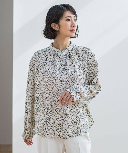 さりげないドットをくずしたような柄が、大人の遊び心を添えるブラウス。ふんわりとしたギャザーシルエットで、体のラインを拾わずリラクシーな着心地です。落ち感のある素材が動くたびに上品に揺れ、オン・オフ問わず活躍します。