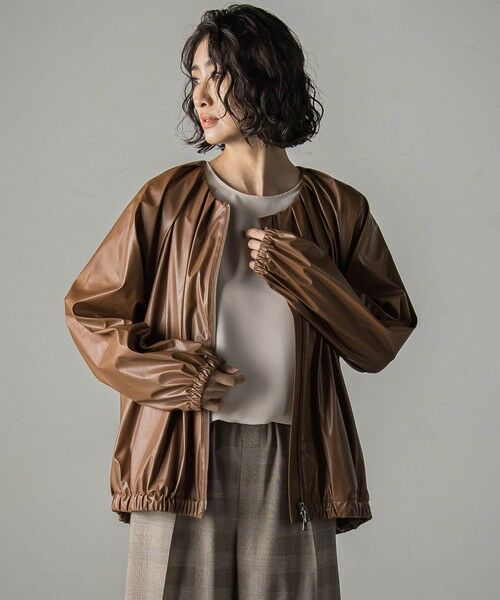 まるで布帛のようにしなやかで薄手なフェイクレザーを贅沢に使用したノーカラーデザインのブルゾン。