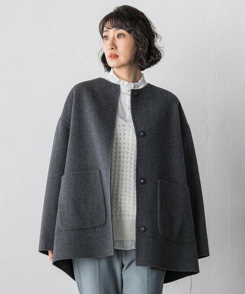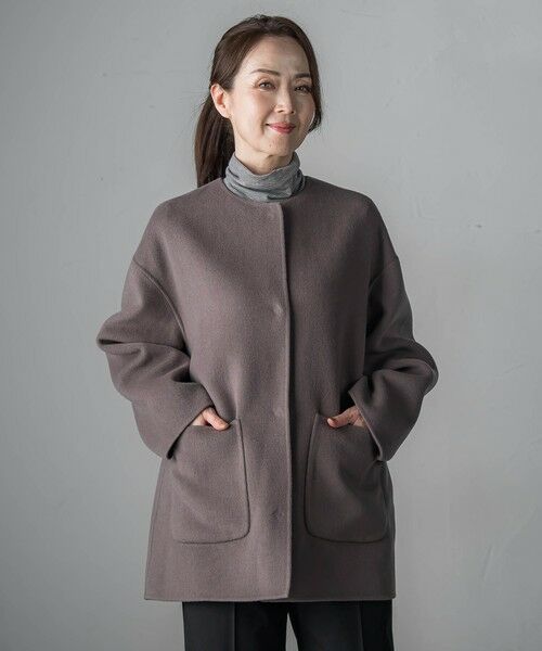 質感高い二重織のウール素材を贅沢に用い、リバー仕立てで仕上げたノーカラーコート。