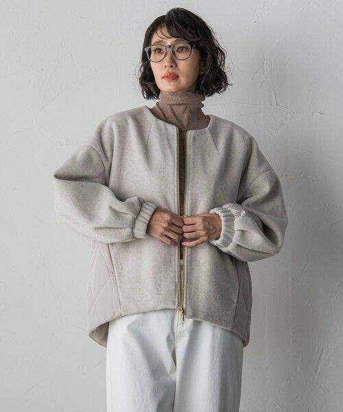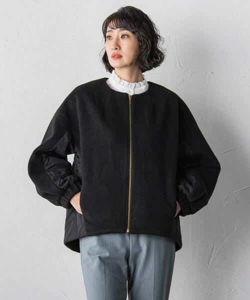 ウールライクなシャギー素材とキルティングタフタをドッキングさせた、表情豊かなノーカラーブルゾン。