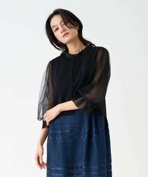 チュールに切り替えられた袖がLANVIN COLLECTIONらしいモード感と女性らしさを演出するニットジャケット。2種類のチュールを重ねることで奥行きのあるシアー感になってます。光沢感とドレープ感が魅力のレーヨン×ナイロンのニットをミラノリブで編み立て重厚感もプラス。オケージョンシーンでもサマになる一枚になっています。モデルサイズベージュ:H170 B77 W58 H85 着用サイズ38ブラック:H165 B77 W57 H79 着用サイズ38