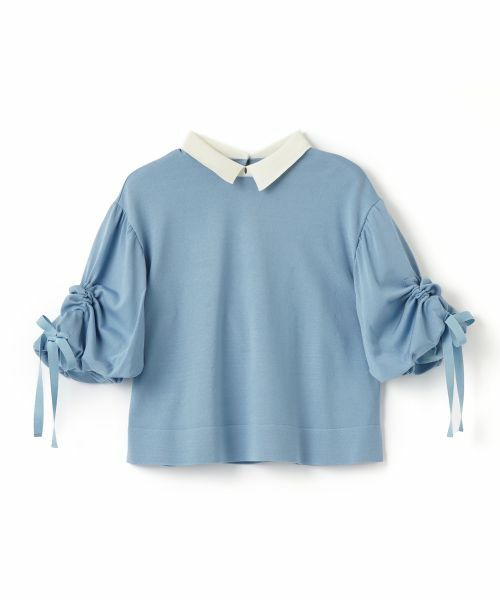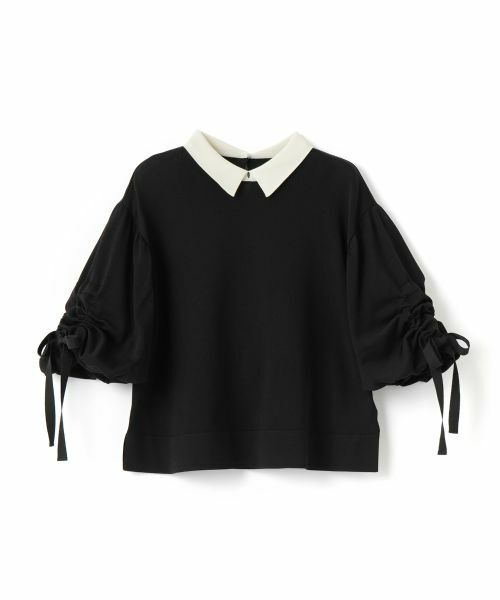 ボリューム感のあるスリーブは、袖口のリボンでギャザーを調整でき、女性らしいシルエットを楽しめるのが魅力。
