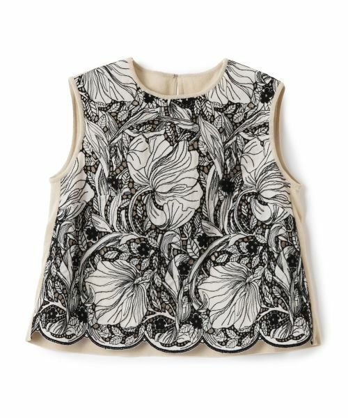 立体感と繊細さのあるアイレット刺繍を施したエンブロイダリーレースとニットをドッキングしたノースリーブトップス。