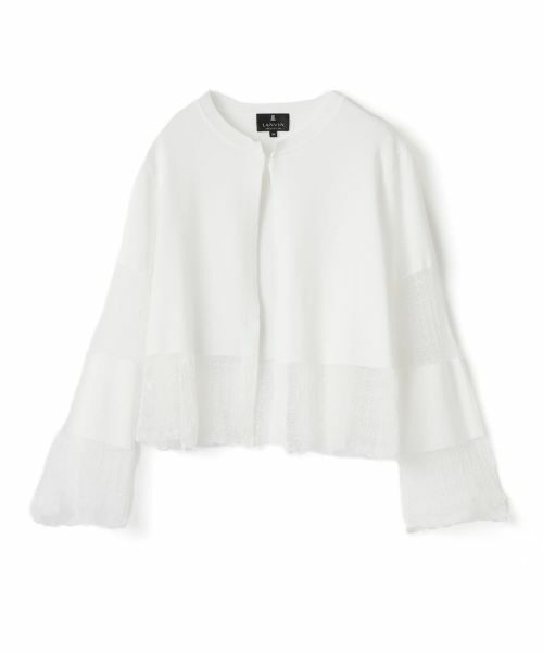 袖と裾に繊細なレースをあしらった、レース切替ニットカーディガン。華奢なレース模様がほどよい透け感を演出し、夏らしい軽やかさを添えます。フレアスリーブとコンパクトな着丈が、バランスのよいシルエットを描き、羽織るだけで洗練された印象に。ピリングに強く、なめらかな肌触りと心地よいフィット感も魅力。冷房対策や日除けにも活躍する、上品なニュアンスが際立つ一枚です。着用モデル:H165 B77 W57 H79 着用サイズ38