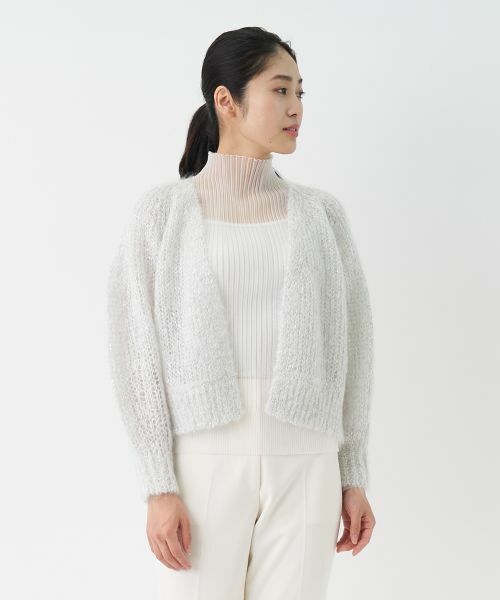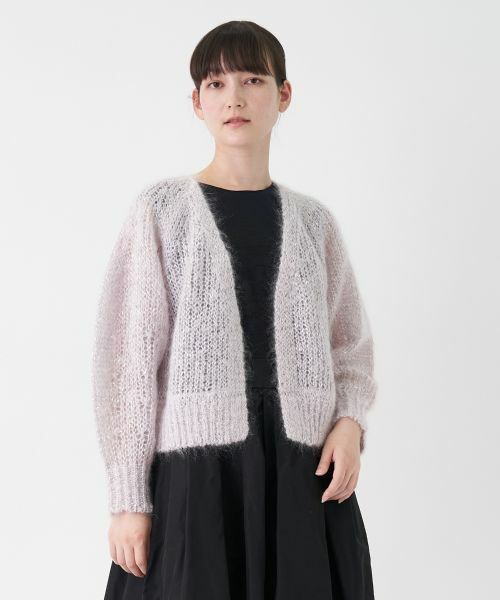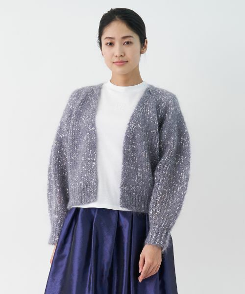 ふわふわとした質感が魅力のモヘヤ混のさりげなくきらめくラメ糸のバランスがエレガントな華やぎを演出するニットカーディガン。