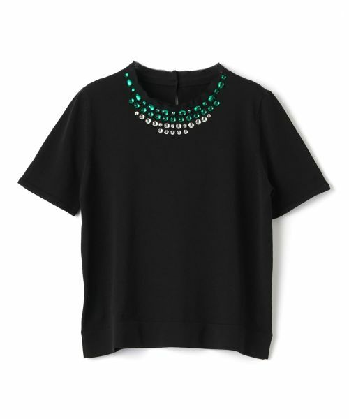 ネックラインを2色のビジューでデコレートしたキラキラ感を放つニットプルオーバー。ネックレス要らずの華やかなデザインがいつものオシャレをアップデート。主役級トップスとして活躍させたいアイテムです。