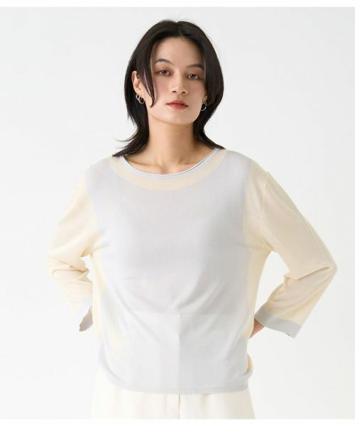 前身頃はインターシャ編み、後身頃と袖は天竺編みにすることで表情のあるニットトップスに。右裾部分にロゴマークを施しさりげないアクセントに。軽やかな素材感でインナーとしても活躍する一枚です。モデルサイズH165 B77 W57 H79 着用サイズ38
