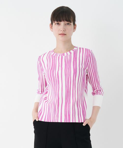 着心地のいいリブニットにランダムなストライプ柄をのせた、カラーコントラストが美しいプルオーバー。やや短めの袖丈&袖口の無地にすることで、より一層華奢な手元を演出できます。デイリースタイルのニュアンスアップにもぴったり。モデルサイズブルー配色 H168 B83 W59 H87 着用サイズ38ピンク配色 H170 B77 W58 H85 着用サイズ38※定価(税込)は、2024年6月28日のセール開始前の店舗における販売価格です。