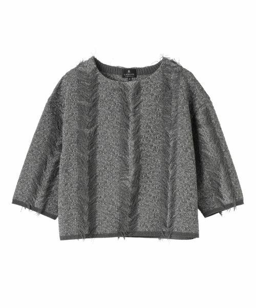 短めの着丈と七分袖がバランス良く映えるニットトップス。マットで繊細な光沢を放つラメ糸が、さりげない華やかさを添えます。インレイ編みでラメ糸の美しさを引き立て、表情豊かなフリンジデザインがアクセントに。ドライタッチで涼しく着られる夏仕様の一枚は、シンプルなボトムに合わせるだけでスタイリングを引き締めます。グレー着用モデル:H170 B77 W58 H85 着用サイズ38ブラック着用モデル:H165 B77 W57 H79 着用サイズ38
