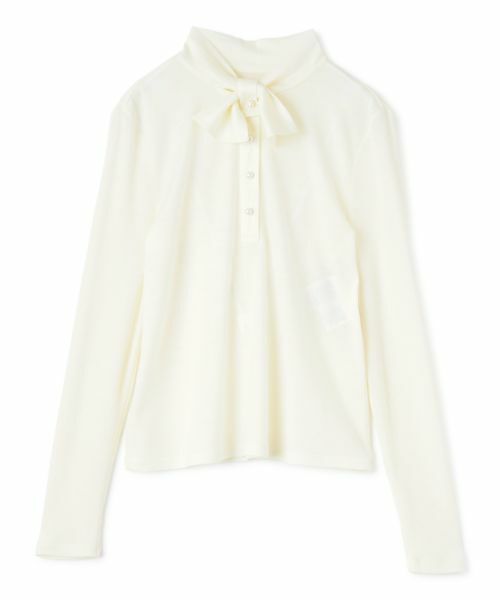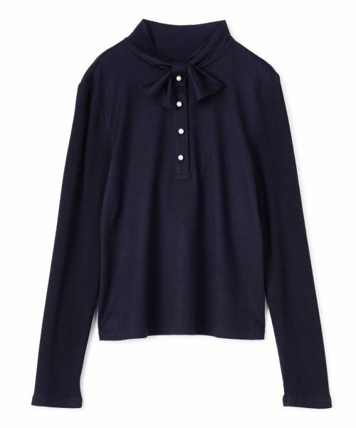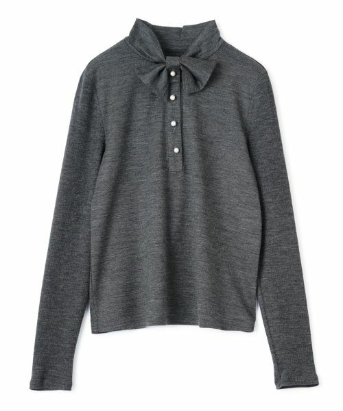 テレコ編みの袖は、身頃と同じ糸を使用し伸縮性と耐久性を両立。リブ編みに近い構造ながらフラットで上品な見え方で、型崩れしにくいのも嬉しいポイントです。フロントディテールにはパール釦を採用し、上品なアクセントをプラス。特に特徴的なのは、衿パーツを変形させ、まるで蝶ネクタイのようなデコレーションを施したモードな遊び心あふれるデザインです。身体に程よくフィットし、単品でも美しいラインを演出します。