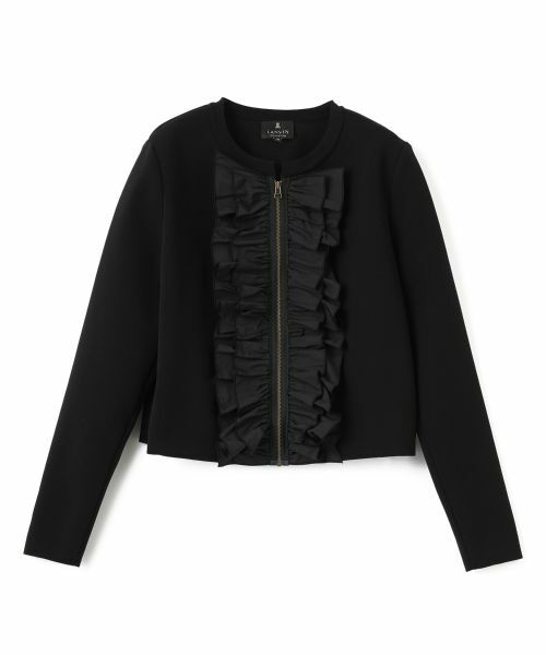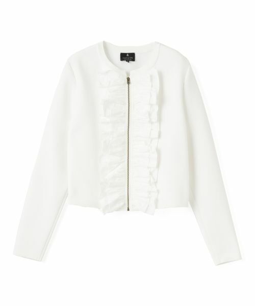 このジャケットは、フロントジップデザインに華やかなフリルを施したエレガントな一着です。シンプルなシルエットながらも、中央のフリルが女性らしさを際立たせ、上品な印象を与えます。軽やかな素材で着心地が良く、フォーマルなシーンからカジュアルなコーディネートまで幅広く活躍。ノーカラー仕様で洗練された雰囲気を演出し、ワンピースやパンツスタイルとも相性抜群です。フェミニンさとモダンなデザインが融合したアイテムです。