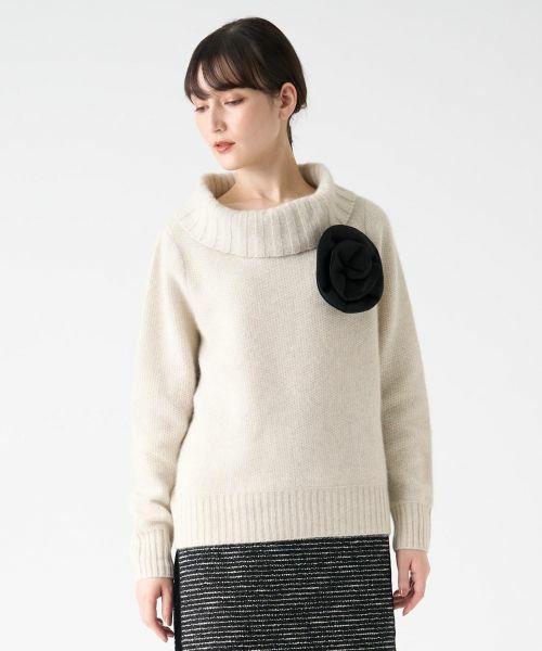 大胆にデザインされたローズモチーフは立体感と膨らみのある仕様にしニットの質感に負けない存在感のあるアクセントに。