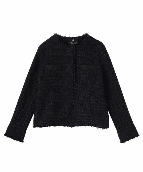 編み組織で奥行きのある風合いを表現したジャケットです。縁にはフリンジのような意匠を凝らし、洗練された表情に。丸首とラウンドフロントのラインが優雅さを際立たせます。胸元のパッチポケットにはグログランテープ、ボタンも同テープで包み込み品格を添えました。バックセンターのフリンジテープが縦長効果を生み、細部までこだわりが光る一着です。着用モデル:H175 B79 W58 H86 着用サイズ38
