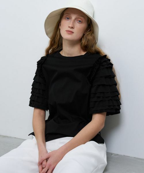 袖にふんだんにあしらわれた、切りっぱなしのフリルが存在感あるアイテム。