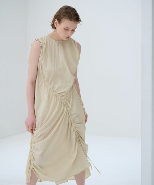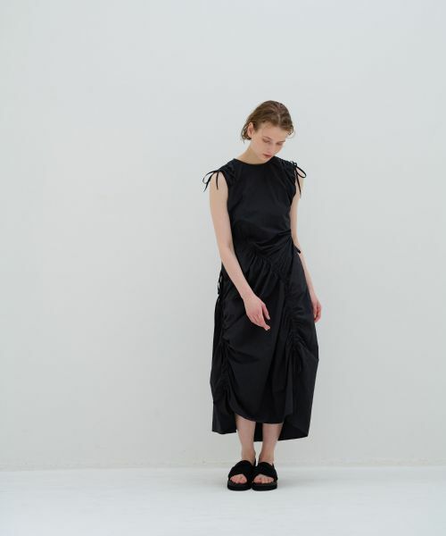 肩やスカート部分、サイドのギャザーを調整して、自分だけのデザインが形成できる、遊び心あるデザインです。