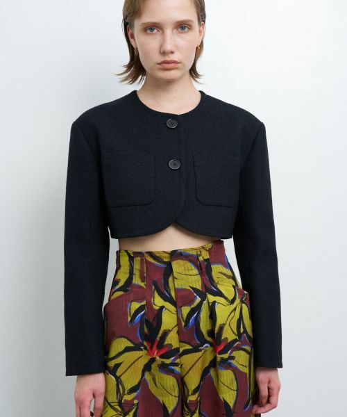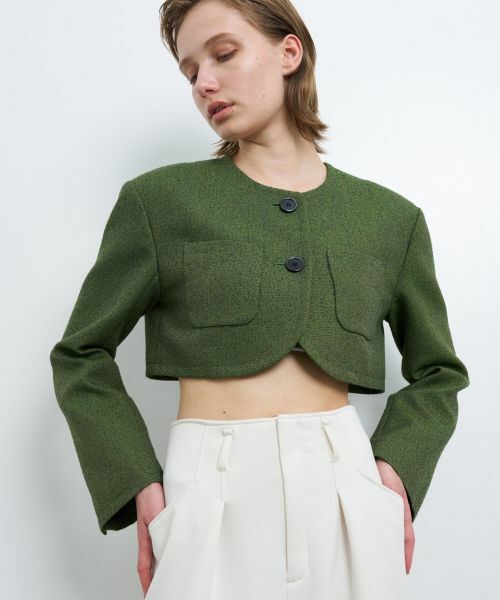 クラシカルなアイテムはショート丈が新鮮。メランジツイードクロップドジャケット