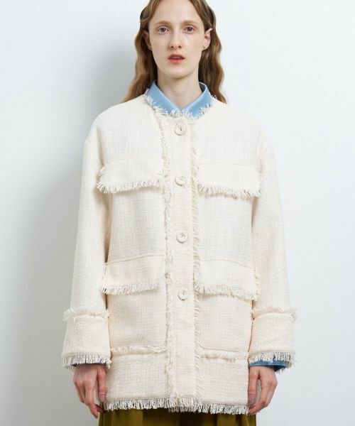 太番手やテープヤーンといった多彩な意匠糸をミックスすることで表情豊かに仕上げたファンシーツイードを使用しています。