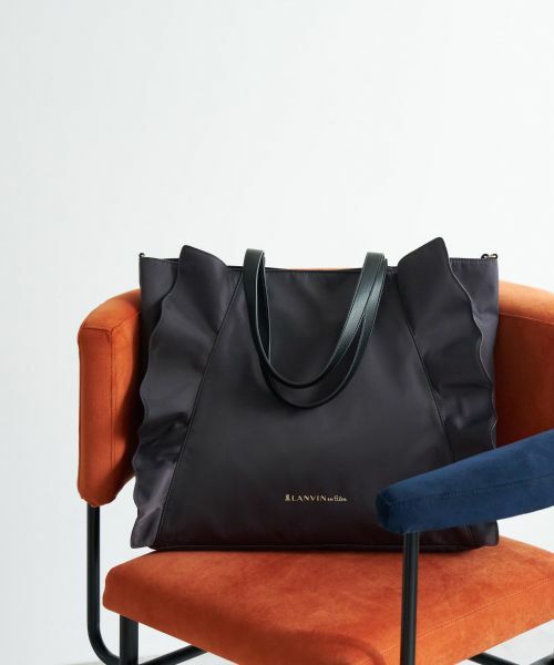 光沢が美しいナイロン生地にロゴやパーツのゴールドがポイントで上品なトートバッグ。
