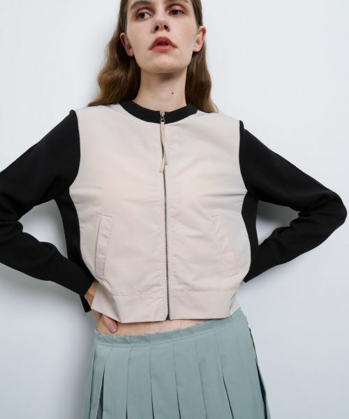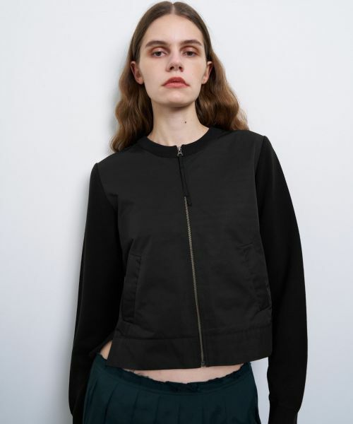 フロントにマットな質感のタフタ生地を使用したニットジャケット。