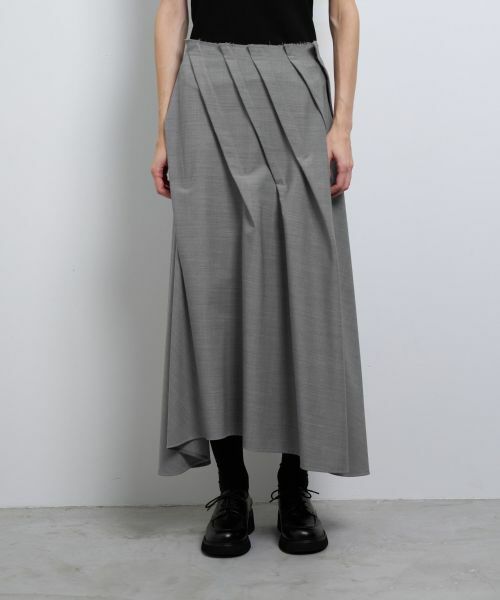 ランダムな斜めタックとイレギュラーヘムで、立体的に仕上げたスカート。