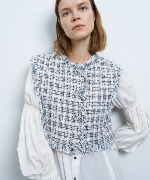 素材 [ブルー] 表地:レーヨン33%,綿30%,ポリエステル24%,アクリル8%,ナイロン4%,キュプラ1%,裏地:ポリエステル100% [ホワイト] 表地:綿72%,レーヨン16%,ナイロン12%,裏地:ポリエステル100%