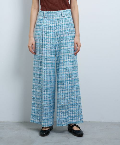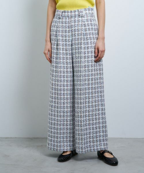ベルトループとタックのディテールがスラックスのようにマニッシュな印象を与えます。
