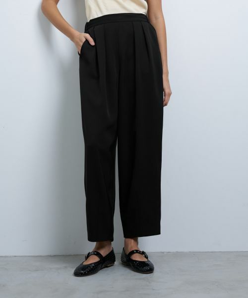 ウエストのタックと少し内側に窄まる裾のデザインで、きれいなコクーンシルエットになっています。