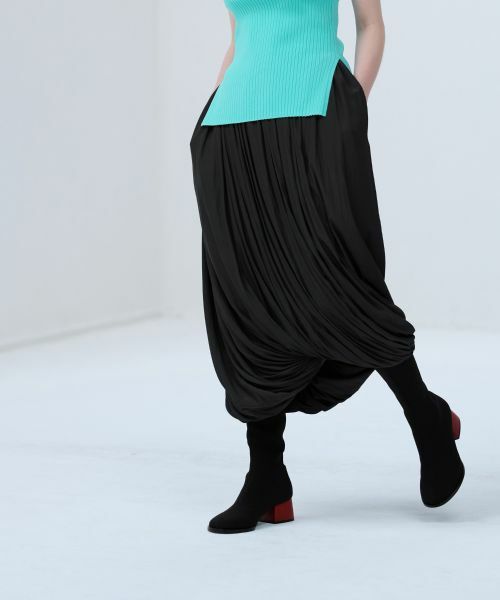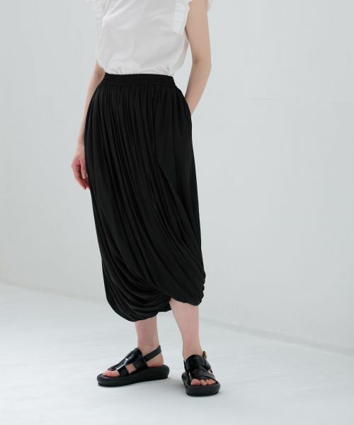 程よくアシンメトリーなデザインが大人モードな表情を見せてくれるバルーンスカート。やや薄手の艶やかな生地を使用した、ボリューム感のあるフォルムが美しいデザイン。フィット感のあるカラートップスなどをインしてみるのも素敵です。