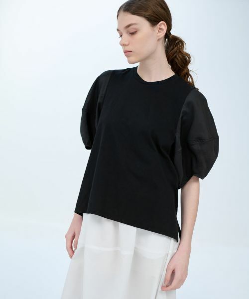 光沢感のあるタフタとのコンビ使いがデザインポイントのカットソー。
