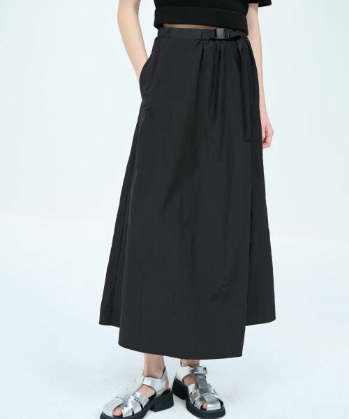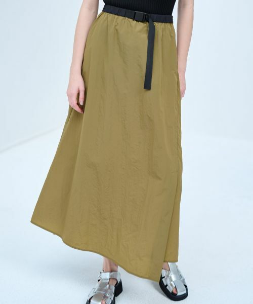 切替でフレアを出し、それぞれの着丈に差を付けることで足元にさりげないニュアンスを持たせたスカート。