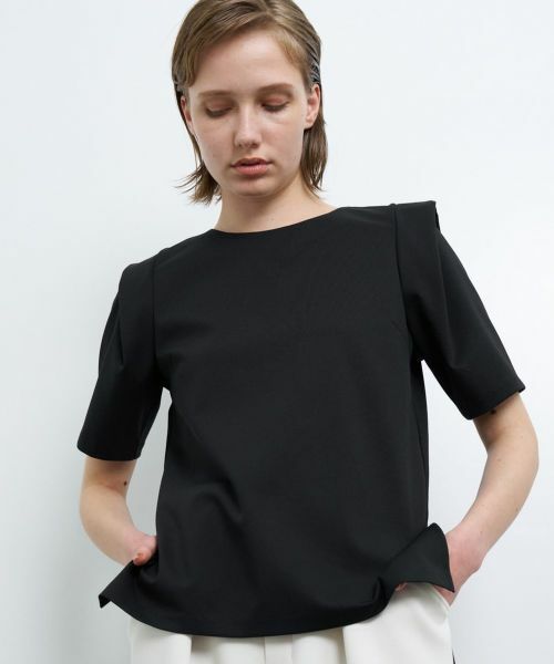 ブラウスのようなきれいめなカットソー生地を使いながら、スクエアな袖のシルエットがモードさをプラスし程よく辛さの効いたアイテム。