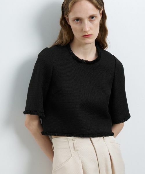 ツイードをフォルムで楽しめるブラウス。ショート丈にワイドスリーブが旬なバランスです。