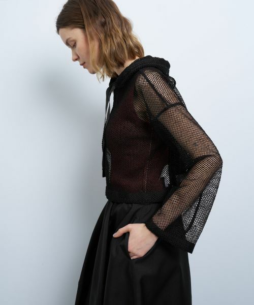 生地は光沢のある糸を使用しており、ざっくりとした編地ながらもカジュアル過ぎないのがポイント。