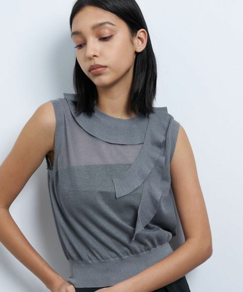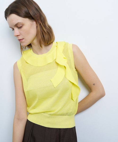 顔周りを華やかにしてくれるフリルが目を惹くニット。