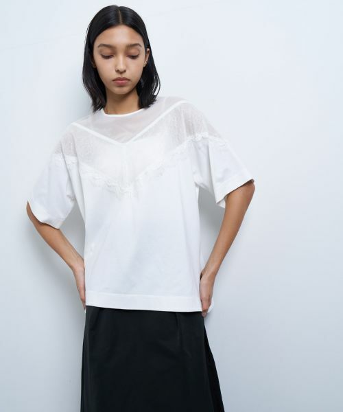 ゆったりしたTシャツに、繊細なレースとシアー生地を使用した、異素材MIXが目を惹くアイテム。