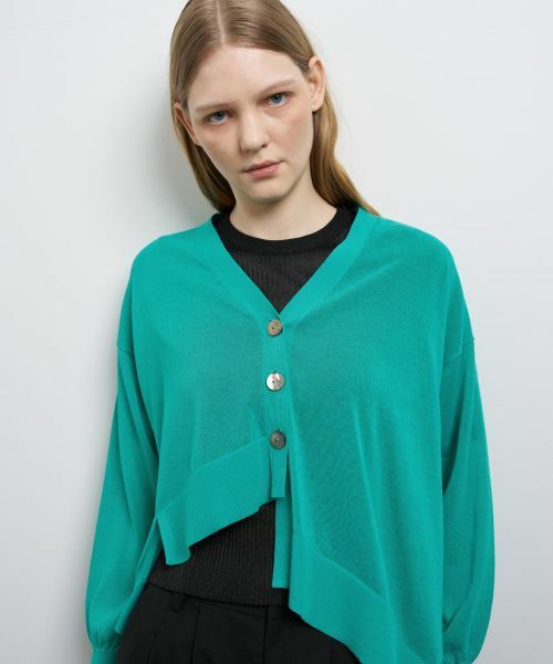 シアーな軽やかさで自然な抜け感をプラスできるアシンメトリーヘムのカーディガン