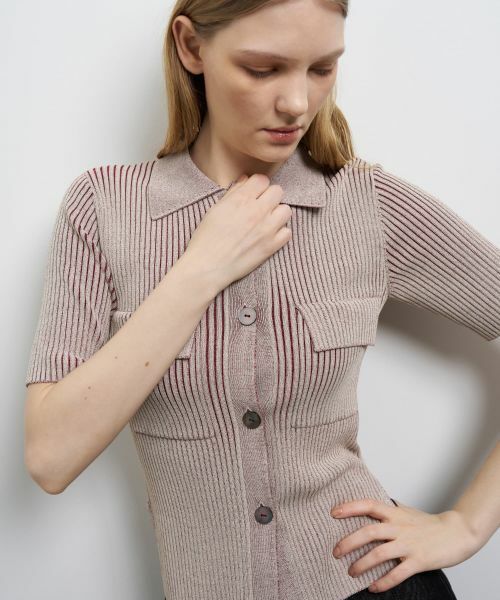 メランジ調のカラーリングが上品なニュアンスを与えつつ、大きめの本貝ボタンがアクセントに。