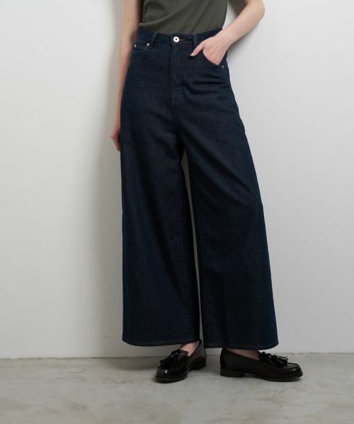 ベーシックなデニムをベースに、ウエスト周りはすっきりと、ワイドながらも広がりすぎずまっすぐ落ちるシルエットにこだわって作られたアイテム。