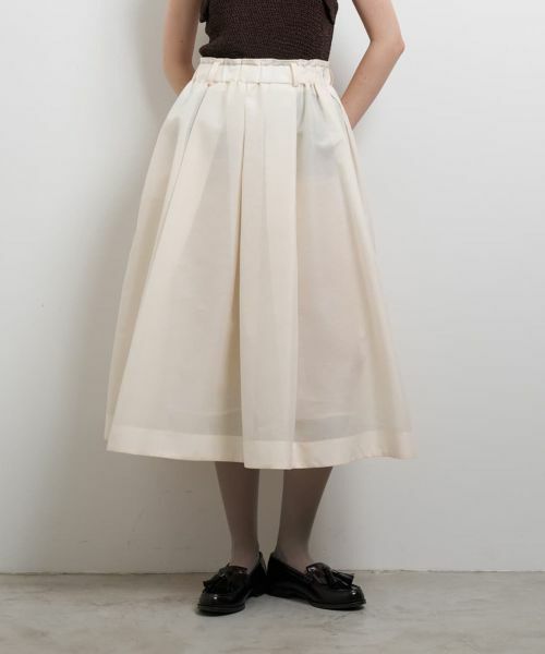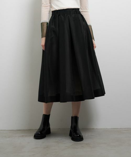 軽やかなシアー感を活かして、シンプルなTシャツやリブニットを合わせた抜け感のあるスタイリングに。コンパクトなトップスをタックインすれば、スカートの立体感が引き立ち華やかな印象に。足元はパンプスで上品に、スニーカーでカジュアルに。ジャケットやシャツを羽織って季節を問わず楽しめる万能スカートです。