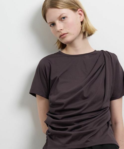 表面の毛羽を極力なくし、上品な艶をたたえたクリーンなカットソー素材を使用。この滑らかな生地だからこそ、タックから生まれるドレープの美しい流れが際立ちます。