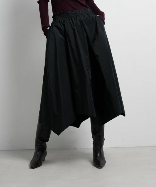 アシンメトリーにカットされた裾が、歩くたびに優雅な動きを生み出すフレアスカートです。