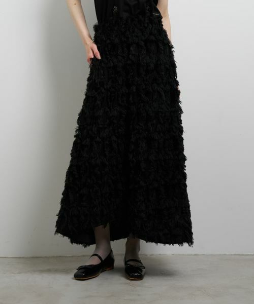 シンプルなトップスを合わせるだけで、一気に華やかで存在感のあるスタイリングが完成します。ウエストはゴム仕様で履き心地も快適。デザイン的にも目立ちにくいので、トップスをインしてもすっきりと見えます。自然に広がるフレアシルエットと、裾のランダムなカーブが、動くたびに優雅な表情を見せてくれます。