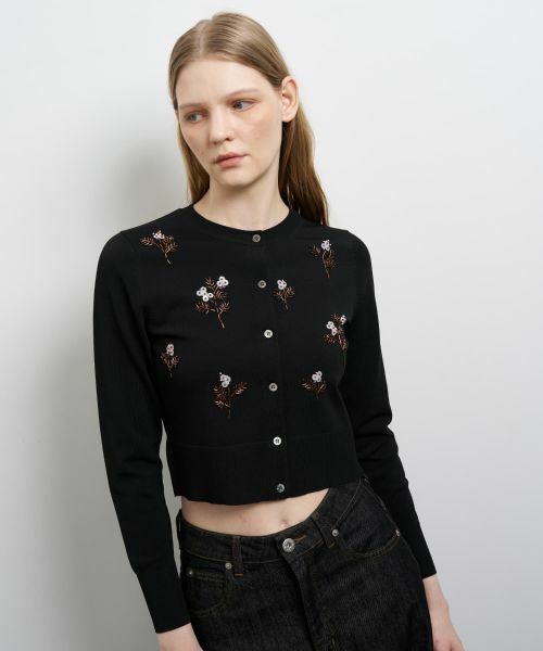今シーズンのテーマ “AUBE & BRUME” (夜明けと霧) から着想を得た、特別なカーディガンです。霧のヴェールの中から、夜明けの光を浴びて現れる花々。その幻想的な情景を、ひとつひとつ丁寧に手刺繍されたビーズの花で表現しています。ランダムに散りばめられたビーズは、ジュエリーのように華やかです。フロントにはロゴを刻んだ上質な貝ボタンを使用しており、細部にまで気品が感じられます。