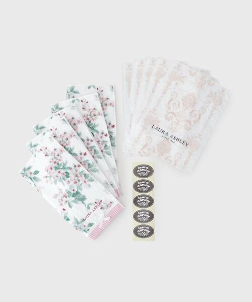 ラッピング用のギフト袋とシールがセットになったハンカチ5枚入りセットです。