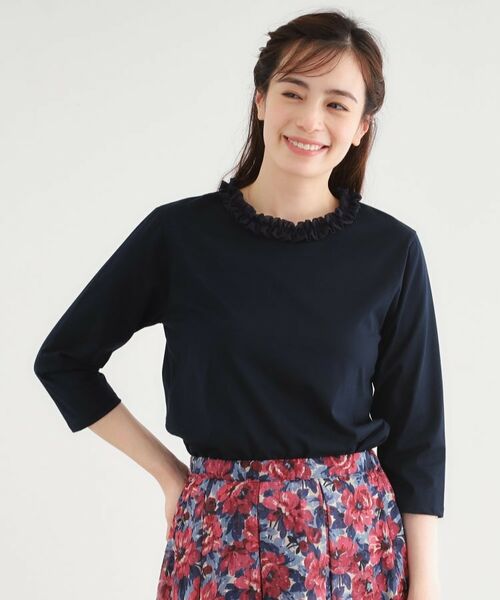 前年好評だった半袖Tシャツのデザインを、秋口から着やすい七分袖にアップデート。衿フリルの素材には透け感のあるシフォンを使用することで軽やかな印象に仕上げました。チクチクしにくいようカット端が肌面に出ない仕様です。ボディには薄手でやわらかい綿素材を使用し着心地を追求。きれいめにも着用できるジャストサイズのフィット感です。※照明の関係により、実際よりも色味が違って見える場合があります。また、パソコン・スマートフォンなどの環境により、若干製品と画像のカラーが異なる場合もございます。本商品は、ご注文確定後に取り寄せにてお客様への出荷手配をさせていただきますので、お届けまでに7~10日前後かかる場合がございます。また、商品は他社サイトと在庫を共有しているため、ご注文いただいた商品が欠品となり、キャンセルとなる場合がございます。