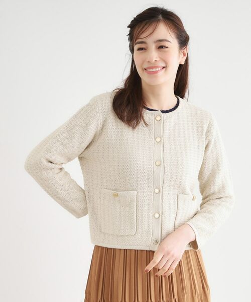 シグネチャーロゴの入った刻印ボタンを施したカーディガン。